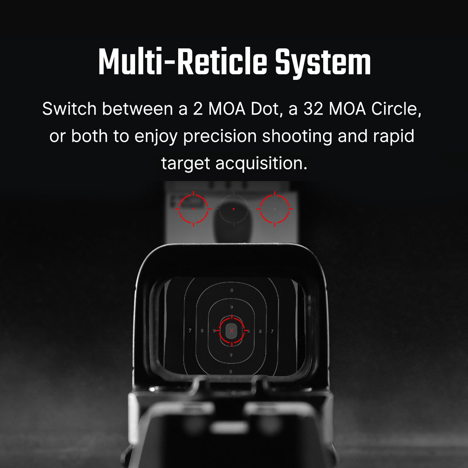 2 MOA Prik & 32 MOA Cirkel: Vælg mellem prik-og-cirkel, kun-prik eller kun-cirkel sigtemidler til enhver skyde situation med en skarp, lys sigteløsning.