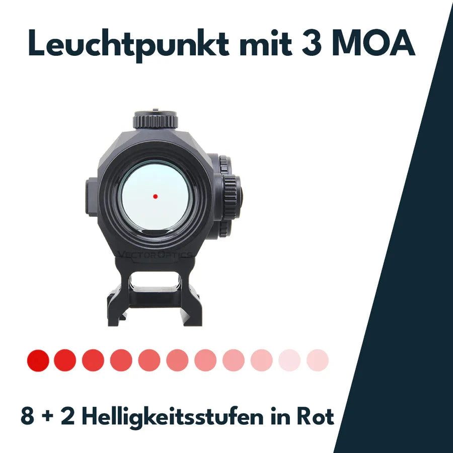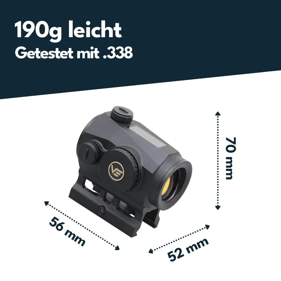 Den tilbyder også tre valgbare sigtemidler, en bevægelsessensor (automatisk slukning efter 2 minutters inaktivitet, og den tænder igen, så snart optikken bevæges), samt i alt ti lysstyrkeindstillinger (inklusive 2 til natkikkert).